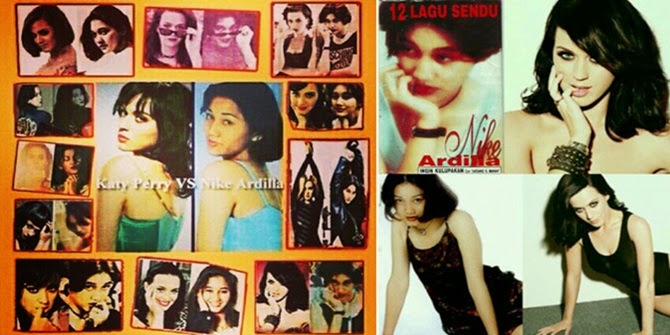 2MATA.NET - Berapa bulan lalu heboh pemberitaan di media online kalau Katy Perry jiplak gaya Nike Ardilla. Banyak bukti foto yang memperlihatkan kalau gaya Katy Perry sama persis dengan gaya Nike Ardilla. Ternyata tak cuma foto-foto itu yang memperlihatkan kemiripan gaya Katy Perry dengan Nike Ardilla. Masih banyak foto lainnya yang beredar di dunia maya. Dan serunya, benar-benar gaya Katy Perry serupa dengan gaya Nike Ardilla. Busana, potongan rambut dan ekspresi wajah keduanya pun sangat mirip. Kalau memang disebut kebetulan, kenapa banyak foto mereka yang sama segala-galanya? Kalau ditelusuri dari sejarah keduanya, Nike Ardilla lebih dulu terkenal menjadi artis ketimbang Katy Perry. Bahkan hingga Nike Ardilla tewas di usia yang masih muda (19 tahun) karena kecelakaan di Bandung, Jawa Barat pada 19 Maret 1995, Katy Perry belum menjadi artis. Sementara Katy Perry yang lahir di Santa Barbara, California, 25 Oktober 1984 ini, baru terjun ke dunia musik pada 1999. Jelas kan kalau Katy Perry memang sangat mengidolakan Nike Ardilla. Bagaimana menurut anda?